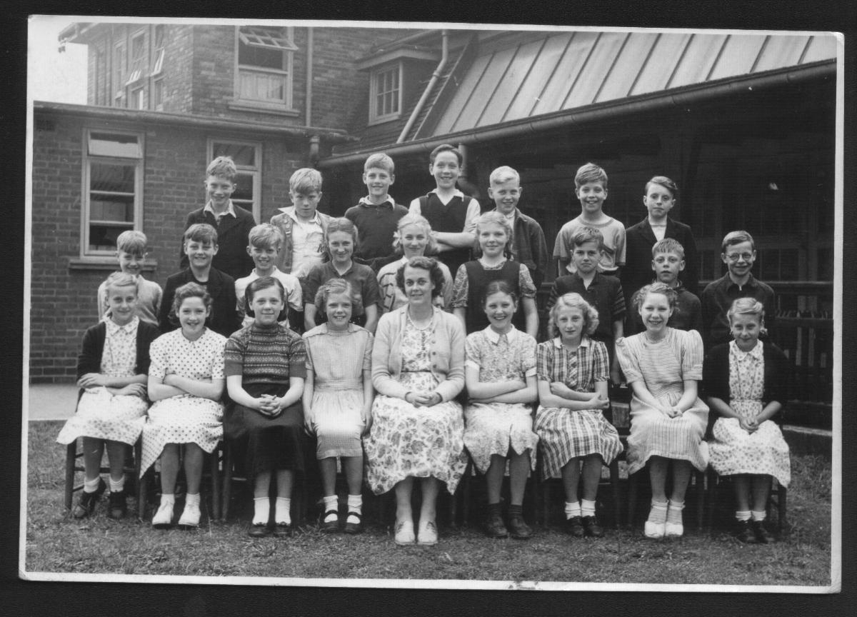 Seated: ? Bright (twin), Eileen Daws, Mary Lambert, Kathleen Shimwell, Miss Merrick, ? ?, Jean Tongue, Pat Beatty, ? Bright (twin).