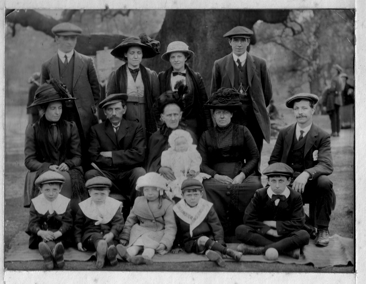 Middle row seated: Mary Elizabeth Hipkiss (nee Jackson), George Jackson (Dad), Ann Burdett (nee Mobs – Grandmother) nursing Evelyn Marshall, Sarah Jackson (nee Burdett – Mother), Thomas Hipkiss.
